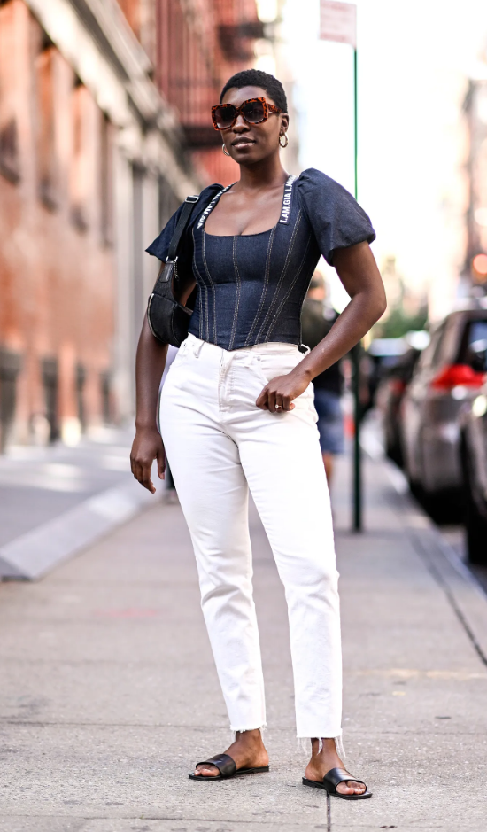 Модерните стилове деним през 2024 г. включват дънки до глезена, права кройка и подгъв над глезена, които подчертават дизайна на елегантни сандали с каишки. Основна бяла тениска и класически черен блейзър завършват тоалета. Ефективна комбинация по всяко време, подсилена от изисканата препратка към черното и бялото.
