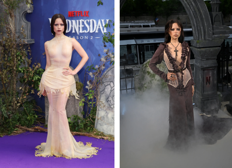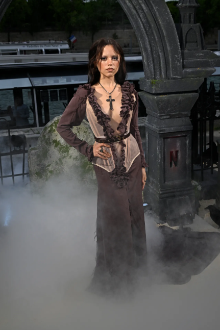 В същото време, по отношение на външния вид, очакванията към Джена Ортега по време на тази пресконференция бяха големи. През 2022 г., по повод излизането на първия сезон на сериала „Сряда“, актрисата ни даде представа за това как би изглеждала готическата естетика, доведена до крайност, с полупрозрачна рокля Saint Laurent, черна рокля от дантела Dion Lee и дори рокля от модното ревю Versace пролет-лято 2023. Тогава Джена Ортега направи препратка към готик гламура с мрачни, секси и много шикозни визии, но през 2025 г. тя променя правилата и сама възражда една тенденция.