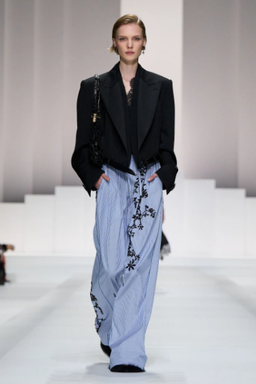 При Chanel скъсеният блейзър намира място в прецизно изработени костюми с неутрално, почти унисекс излъчване, комбиниран с прави туидени панталони за минималистична и съвременна елегантност. В колекциите на Dior той се превръща в силно женствен акцент – носен като основен елемент вместо блуза, с подчертана талия и деликатен силует, съчетан с плисирани мини поли в сходни тонове и меки пастелни нюанси.По-непринудените и дръзки версии също изпъкват: при Roberto Cavalli блейзърът се носи директно върху кожата, с дълбоки изрязвания и панталони с много ниска талия, докато при Dolce & Gabbana той играе ролята на стилен завършек към по-спокойни визии, като свободни раирани панталони с лежерен, почти домашен характер.