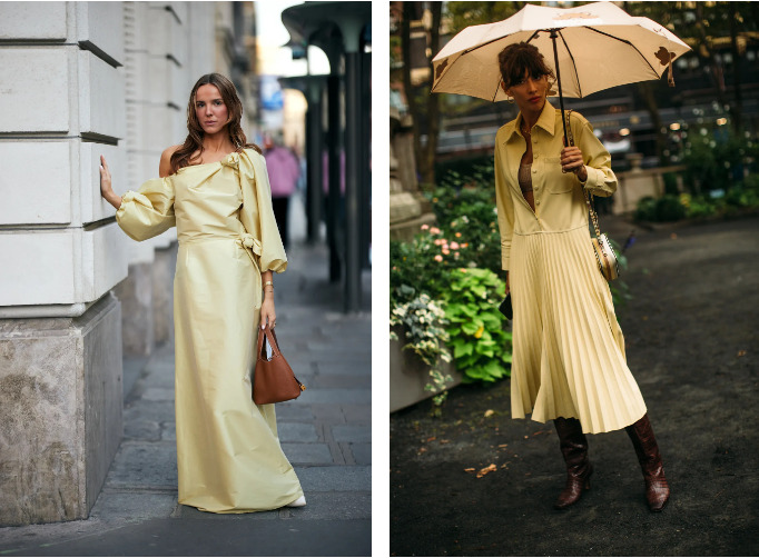 Масленожълтият цвят се превръща в универсален избор за всяко време на деня. Сутрин го виждаме в мини рокли с А-силует, свободни кройки с тънки презрамки в стил 90-те или модерни визии с плоски сандали. Съчетава се чудесно с неутрални тонове като бежово, пясъчно или млечнобяло, създавайки леки и свежи аутфити – идеални за разходки в града или летни ваканции.През нощта масленожълтото засиява с още по-голяма сила. Изберете миди или дълга рокля от сатен или с елегантна драпировка, и ще постигнете стилна и запомняща се визия. Аксесоарите са ключът: златните детайли добавят блясък, среброто – класа, а наситени тонове като амарант или тъмносиньо придават модерен контраст.