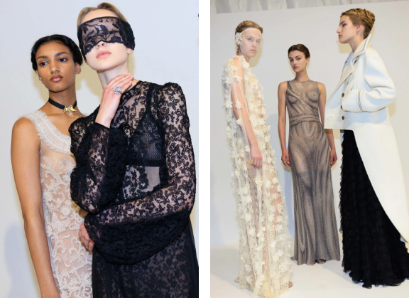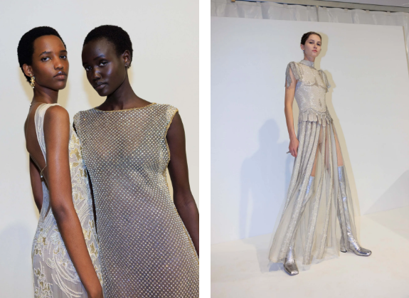 Първите модели на ревюто са четири елегантни ансамбъла от двулицев кашмир – панталон и фрак, изработени изцяло на ръка. „Това е висша мода – най-простото често е най-трудно за изпълнение“, казва дизайнерът. Следва серия от дълги, ефирни рокли с безброй дантелени ефекти: релефни цветя, мрежести волани, изрязани листа, ар деко мотиви и златни ресни. Бельото е видимо, а обувките – равни, подчертаващи естествената лекота на визията.