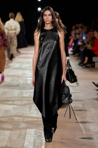 Дълга туника, носена върху панталон при Balenciaga, мини модел без презрамки в страстно червено при Givenchy, структурирана рокля с флорален мотив на подиума на Loewe,друга – изработена от миниатюрни колани в телесен цвят при Courrèges или пък рокля „втора кожа“ в два нюанса при Hermès… Кожената рокля предизвиква максимален ефект на подиумите по света, повишавайки моментално секси индекса на жената, която я носи.