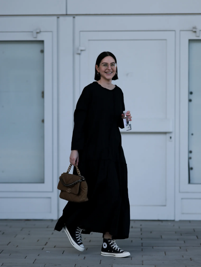 Цялостният черен тоалет, състоящ се от дългата бохо рокля и Converse Chuck Taylor All Star, е вечен и винаги готин. Което потвърждава, че комбинацията от маратонки и черна рокля, представена на ревюто на Balenciaga и Kenzo за пролет-лято 2024 г., се е пренесла и в уличния стил.