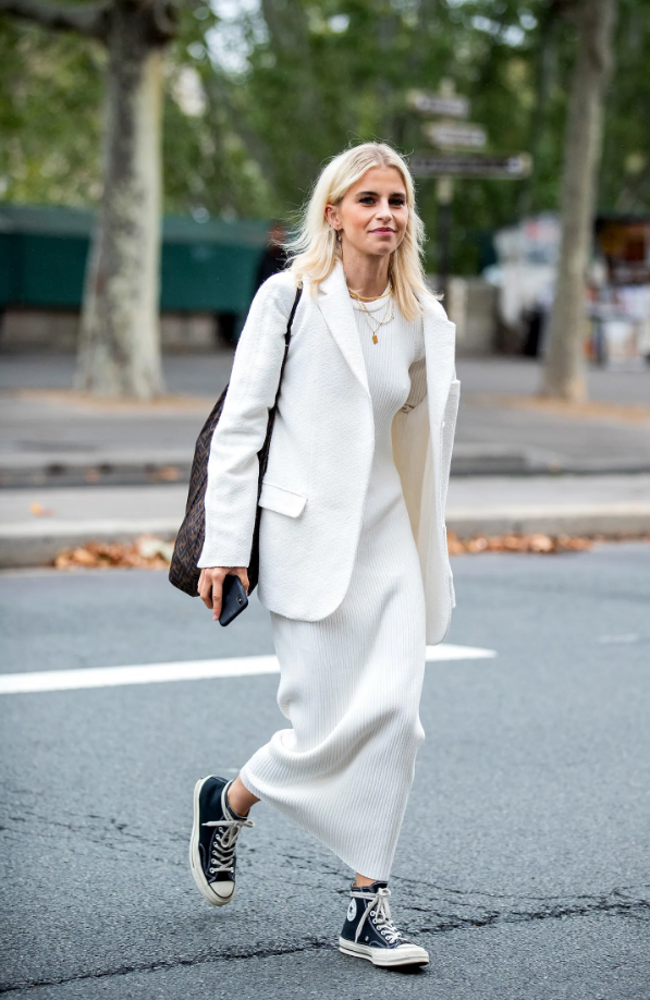 Converse с лекота преминават от лятото към есента: перфектни са, когато се носят в контрастен цвят с дълга вълнена пола или плетена рокля и подходящ oversize блейзър. Наполовина модерни, наполовина характерни.