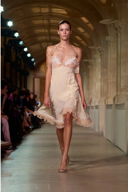 При Dior, Джонатан Андерсън облича своя модел – напомнящ на кринолин – в дантела около деколтето.Haider Ackermann връща златната епоха на Том Форд с прозрачна черна slip рокля, която перфектно следва извивките на Алекс Консани.А при Dolce & Gabbana моделът достига нови върхове на съблазнителност, както и при Ferragamo, където дантелата засия в златен блясък.