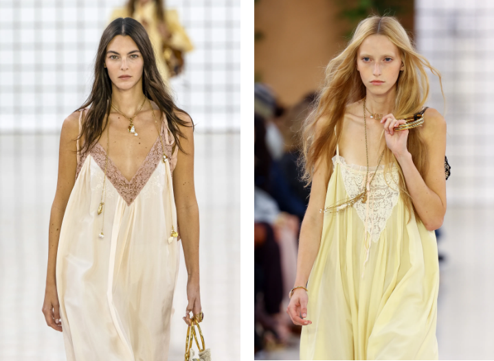 Вдъхновена от филмовите икони на 50-те и дори легендарната Бети Буп, роклята Nuisette (или baby doll) винаги е била символ на женственост и съблазън. Днес обаче тя се завръща с нова, по-романтична и бохо аура, превръщайки се в ключова тенденция за пролетта.Със своето нежно падащо деколте, деликатни дантелени детайли и ефирни материи като коприна и сатен, nuisette роклята съчетава в себе си нощно облекло и бохемски шик. Лекотата ѝ я прави перфектен избор за топлите дни, а модните къщи я преоткриват с нов прочит.Най-големият посланик на тази тенденция е Chloé, която в последните си колекции представи модели в пастелни нюанси и с винтидж препратки към 70-те. Дантелените волани и фините прозрачни елементи добавят нотка романтика, която прави роклята задължителен елемент в гардероба този сезон.