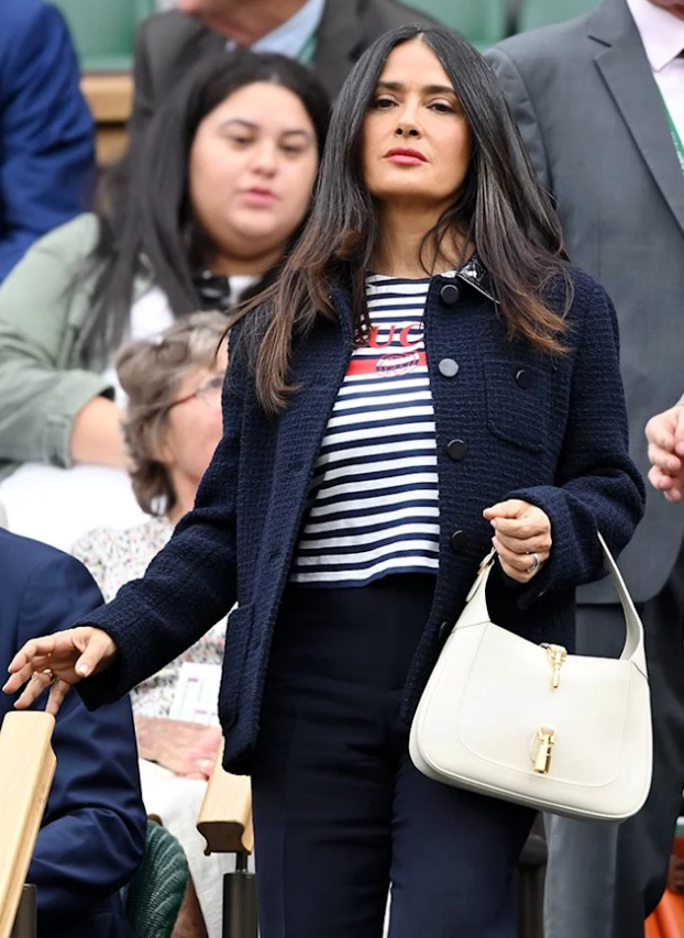 Докато се отправяше към кралската ложа, 57-годишната Салма се появи с тъмносиньо елече. С блейзър от букле и панталони по мярка, А-листата допълни визията си с раирана тениска на Gucci, кремава чанта и слънчеви очила в тон.