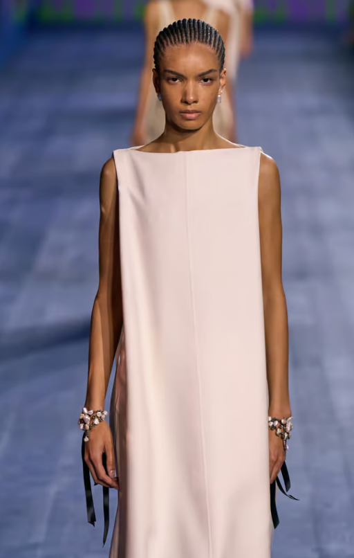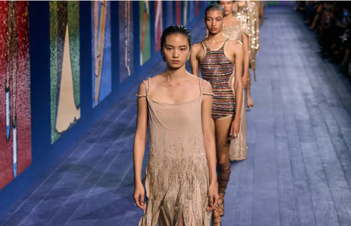 Отдавайки почит на Олимпийските игри месец преди игрите в Париж, Dior представи бляскави, макар и неправдоподобни спортни облекла, включително бански костюми със златни пера и червен халат, украсен с мозайки от огледала.