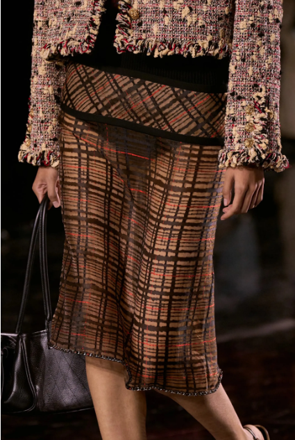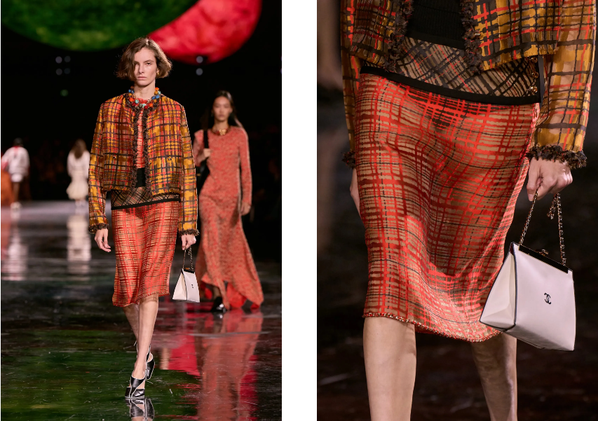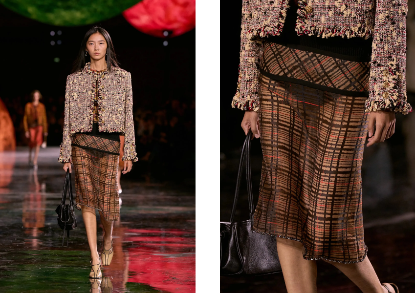 Първо ревю за Chanel, първи успех за Матю Блейзи. За 115-те години съществуване на модната къща, френско-белгийският дизайнер е едва четвъртият ѝ артистичен директор след Габриел Шанел, Карл Лагерфелд и Виржини Виар. Той се потапя в емблематичните кодове на френската къща и ги преработва в духа на новото време — от култовите двуцветни обувки с ток до туида, чиито правила напълно преобрази.Матю Блейзи напълно деконструира материята, за да придаде на моделите усещането за преживяно минало — сякаш са преминали през времето и разказват собствена история. Известният туид се появява разнищен, понякога с плитки кантове или нежно бродиран.Акцентите в колекцията? Двете slip поли, вдъхновени от вълнен ластичен плат, представени в нюанси на оранжево и бежово.