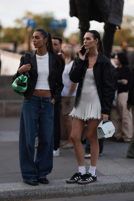 Нора Атал и Витория Черети задават тона, когато говорим за смели визии извън офиса. Вдъхновени от Ceretti, избираме романтична плисирана мини рокля, съчетана с вечни бели кецове – комбинация, която никога не излиза от мода. Финалният щрих? Миниатюрна чанта, класическо сако и бели чорапи за небрежно шик излъчване.