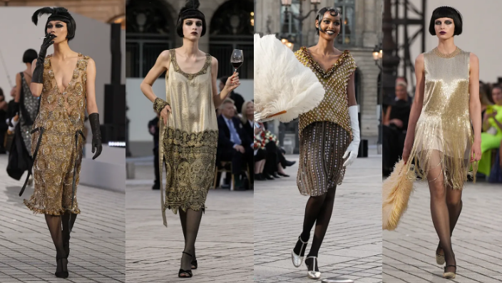 Откриващият пасаж на шоуто, включващ пет ослепителни вечерни рокли от Chanel, обхващаше цели 100 години - от 1924 до 2024 г. Сред тях имаше декоративни визии, вдъхновени от 20-те години на миналия век, и позлатени рокли от Dries Van Noten, Dior и Miu Miu. Вие също можете да се обличате като в златната епоха.