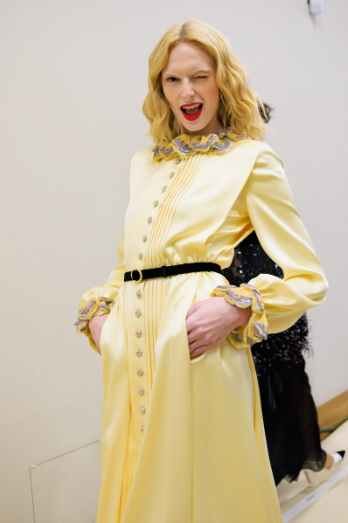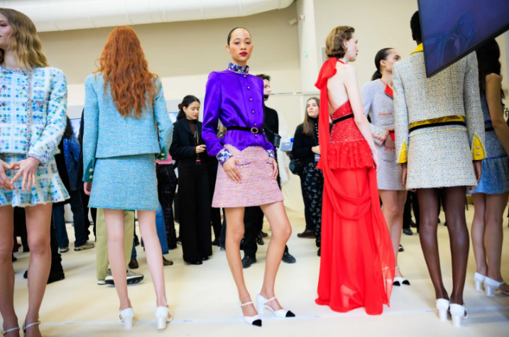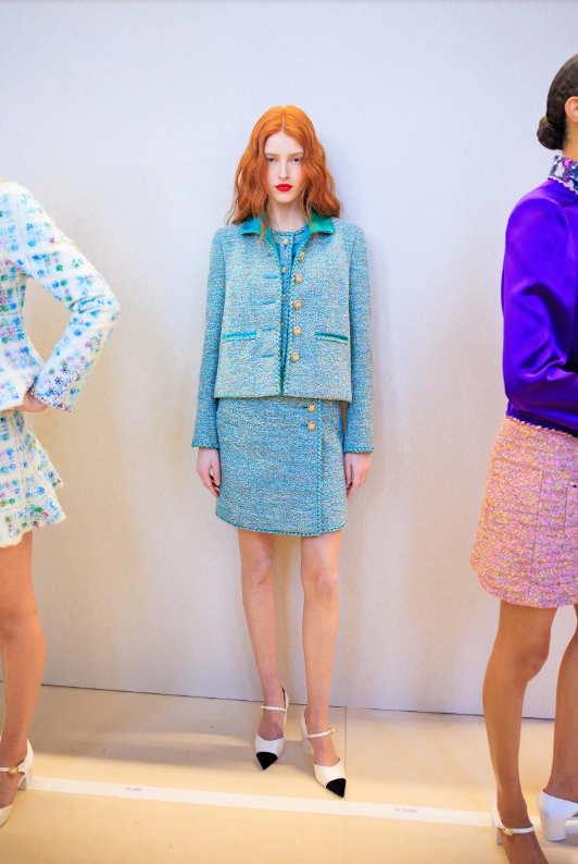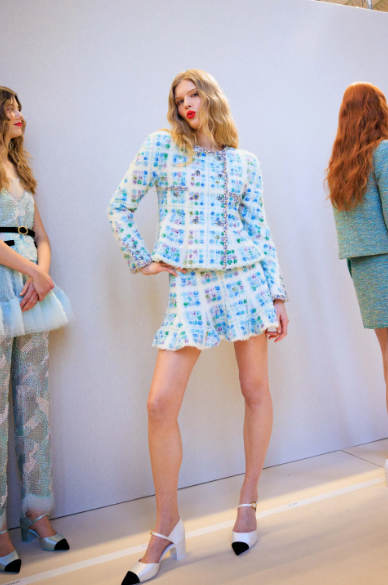 Розово и виолетово, мимоза и бебешко розово, поп жълто и златно, шампанско и огнено червено... Цветовете се сблъскват, придавайки нов ритъм на визията. Като силует на бабидол 2.0, в съответствие с кодовете на Дом Шанел. Плитките придават графично измерение на сакото от туид, а ювелирните копчета на маншетите разкриват блестящ накъдрен тюл. Общо не по-малко от 55 визии поставиха началото на хроматична хореография под стъкления покрив на Grand Palais, под музиката на композитора Густав Рудман в сътрудничество с Мишел Гобер.