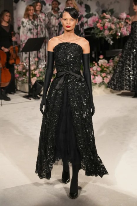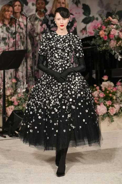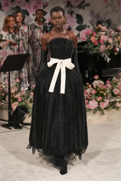 Подобен парад от черно-бели вечерни облекла откри ревюто, често пристегнати с украсени с панделки колани и придружени от оперни ръкавици. След като тази част от пищни рокли и гащеризони, наподобяващи смокинги, приключи, Куин въведе цвят чрез чаени рокли, украсени с 3D флорални апликации, и рокли с пелерини, покрити с огромни яркорозови рози. Това беше ясно продължение на паралелните дизайни, които видяхме в септемврийското ревю.