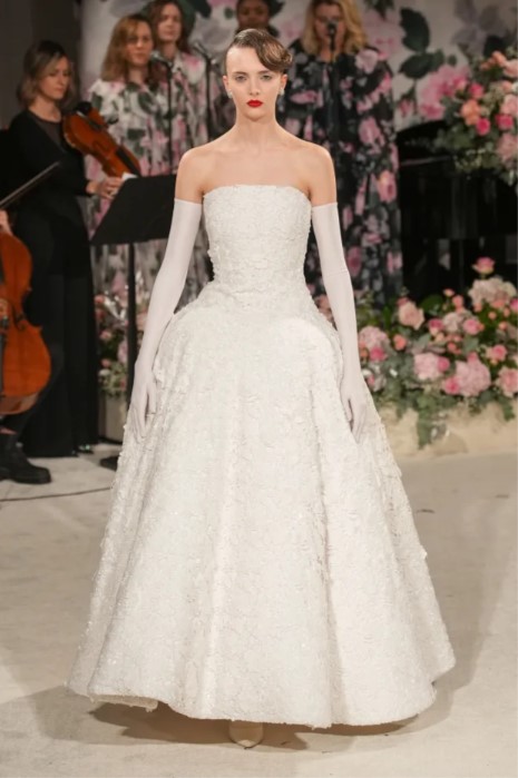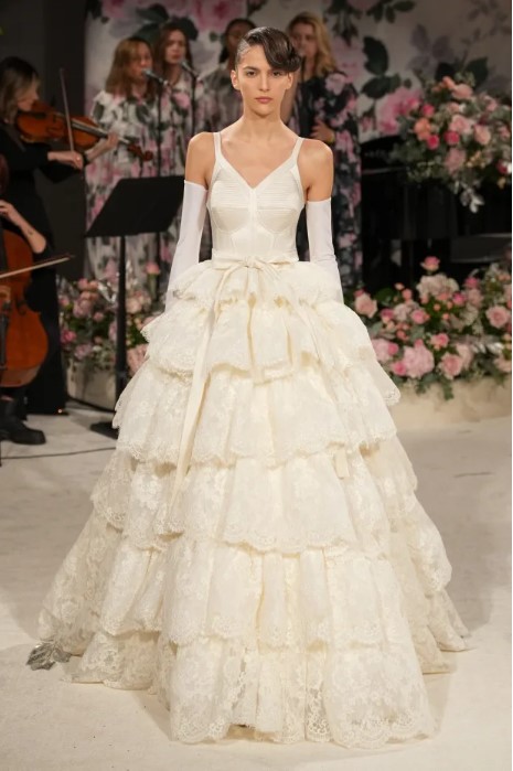 Различно от миналия сезон обаче беше заключението на колекцията: капсула от дванадесет броя булчински визии, пълна с украсени с розети тромпети, А-линии, бални рокли и по-романтични силуети в кремаво и бяло, с воали от тюл в тон.