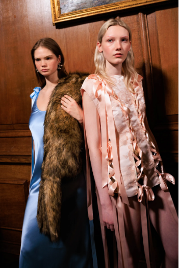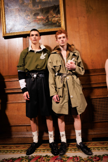 Simone Rocha черпи вдъхновение и от училищните униформи, които носела като дете в Дъблин. Този мотив оживява на подиума чрез визии, напомнящи за ученическия двор – от разкъсани ръгби тениски и къси панталони до елегантни интерпретации на директорката и учителката. Разнообразието в стиловете подчертава контраста между различните персонажи: от невинната ученичка, облечена в жилетка с флорални мотиви, къси панталони и пудренорозова рокля с панделки, до бунтарката, залагаща на кожени мотоциклетни якета, BDSM вдъхновени колани и смели прозрачни материи.